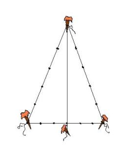- Get four pegs and three ropes. Two of the ropes should have an odd number of knots, evenly spaced. (The reason for an odd number is to make it easy to find the center.) One of the knotted ropes must be much longer than the other.