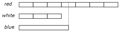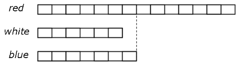 In order to solve our problem, we need to have all bars in terms of the same size unit. (In algebra, this would be putting everything in terms of a single variable.) Since the middle unit of the red bulbs has been cut in half by the dotted line, let’s cut all the other units in half, too. And we’ll cut the blue bar the same way: