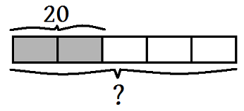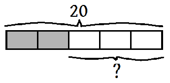 With problems like this, we begin to reap the full benefit of our work on learning bar diagrams. Instead of struggling to understand the algebraic reasoning required to solve something like \frac {2}{5} \times [?] = 20, our students can draw: