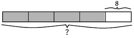The end-of-workbook review takes the students through several multi-step fraction problems. In algebra, this calculation would look like \left( 1 - \frac{4}{5} \right) x = 8. With a bar diagram, it’s easy:
