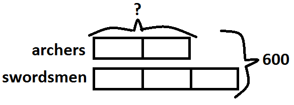 The ratio tells how many parts (units) to draw for each group. 2:3 means 2 units of archers and 3 units of swordsmen: