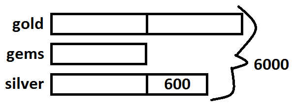 We are comparing the number of pieces of gold, gems, and silver, so we will need three bars. The fewest are the gems. There are twice as many (notice the ratio?) pieces of gold. And the pieces of silver match the gems plus 600 more: