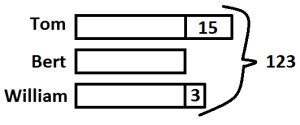 In this case, we will need three bars — one for each troll’s amount of gold. We’ll label each treasure with the troll’s name. (My kids would usually just put the troll’s initial.) Notice that Bert has the smallest number of pieces. Tom has Bert’s amount plus 15 more, and William has Bert’s amount plus 3 more.