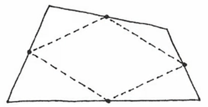 If you take any 4-sided shape at all — make it as awkward and as ridiculous as you want — if you take the middles of the sides and connect them, it always makes a parallelogram. Always! No matter what crazy, kooky thing you started with.