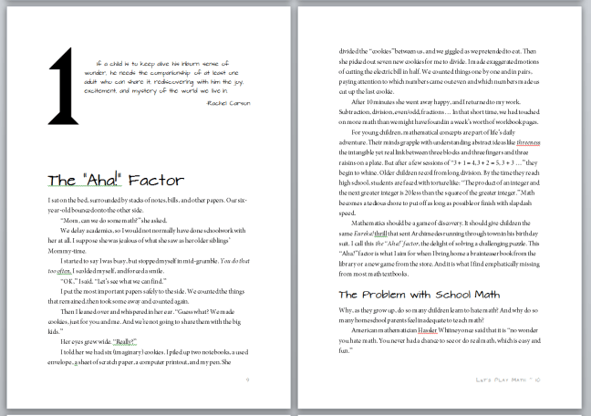As I’ve been working on the layout for the paperback edition of Let’s Play Math: How Homeschooling Families Can Learn Math Together, and Enjoy It!, I thought, “Why not post an excerpt?” So here is the introduction and first chapter, free to download: