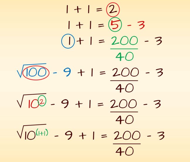 The first player writes a simple equation at the top of the paper, such as “1 + 1 = 2.” Then all players take turns complexifying this equation.