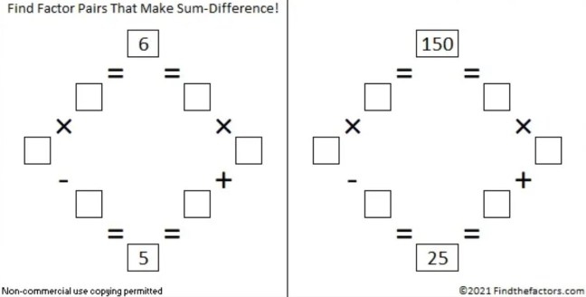 Six has two factor pairs. One of those factor pairs adds up to 5, and the other one subtracts to 5. Can you place those factors in the proper boxes to complete the first puzzle?