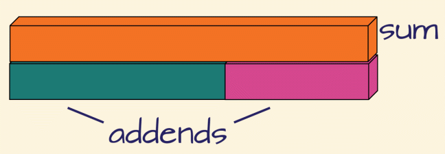 When we build an addition pattern with Cuisenaire rods, we can see all three numbers and how they relate.