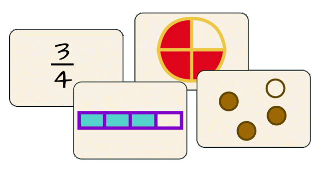 Equivalent Fractions: Instead of matching the fraction and pictures exactly, players may take any two cards that name the same amount of stuff. A card labeled 3/6 can match with a picture of 2/4, since both of them are worth half of one whole thing.