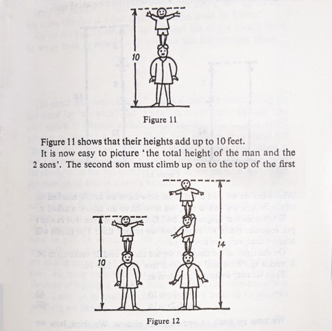Not only can children solve puzzles like this, but even better — they can make up story puzzles of their own. You could spend a whole week or more making up silly height puzzles for each other to solve. By the time you were done, your kids would have a great introduction to algebra!